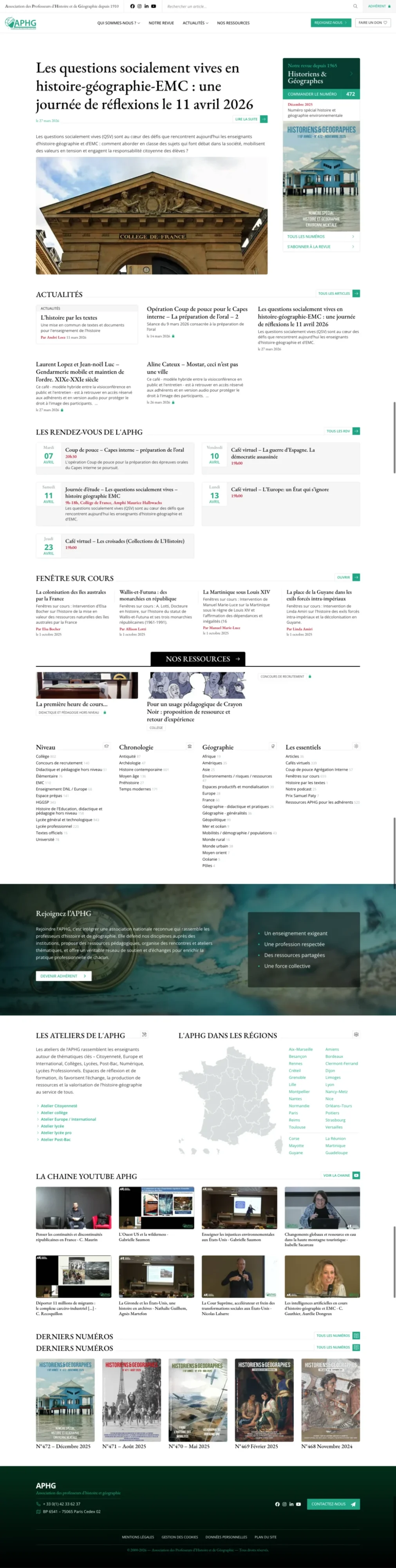 Sur ce projet, j’ai accompagné l’APHG dans la conception et la mise en place d’un site à la fois structuré, performant et évolutif, pensé pour répondre à des enjeux éditoriaux, communautaires et techniques.