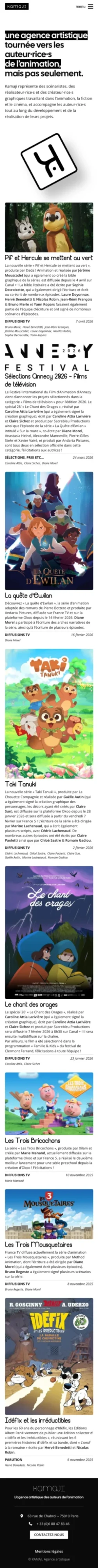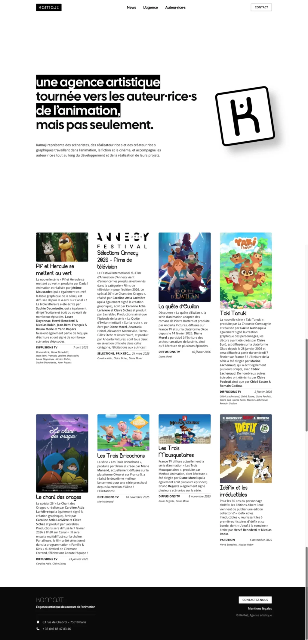 Pour l’agence Kamaji, j’ai conçu un site épuré qui laisse toute la place aux œuvres des animateurs. Le design est volontairement discret pour mettre en avant les visuels, les rythmes et les intentions propres à chaque auteur.