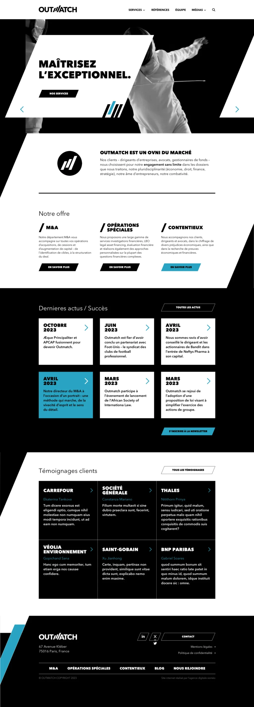 Pour le projet Outmatch, j’ai conçu une interface sur mesure mêlant exigence technique et identité visuelle affirmée. Le design repose sur des contrastes marqués et une esthétique volontairement directe, traduisant l’efficacité, la rigueur et l’approche offensive du cabinet de conseil.